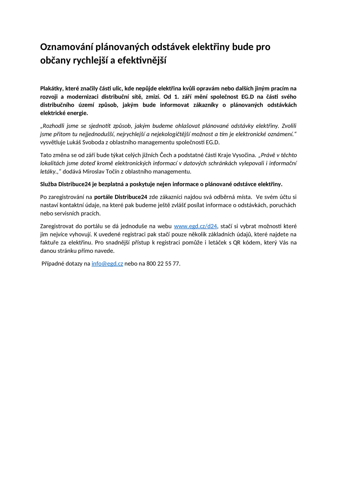 Od 1. září mění společnost EG.D (dříve E.ON) na části svého distribučního území způsob, jakým bude informovat zákazníky o plánovaných odstávkách elektrické energie. Více informací v přiložených souborech.