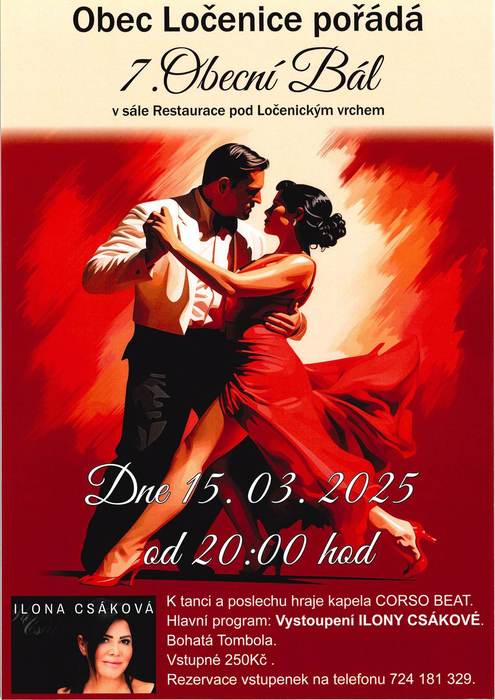 Předprodej lístků na 7. Obecní bál, který se bude konat 15. března 2025, byl zahájen v pondělí 3. února 2025. V hlavním programu vystoupí Ilona Csáková