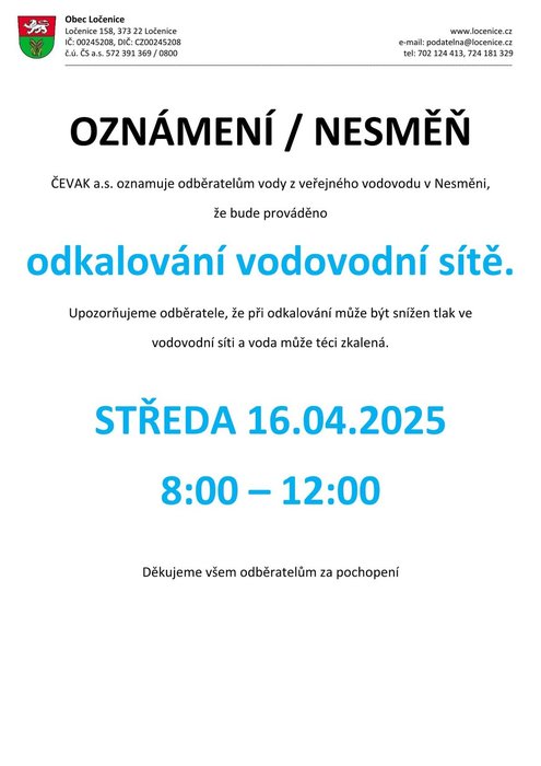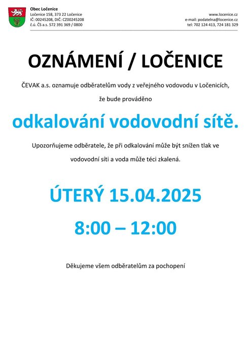 Odkalování vodovodní sítě proběhne v Ločenicích 15. dubna a v Nesměni 16. dubna 2025, vždy od 8:00 do 12:00 hodin.