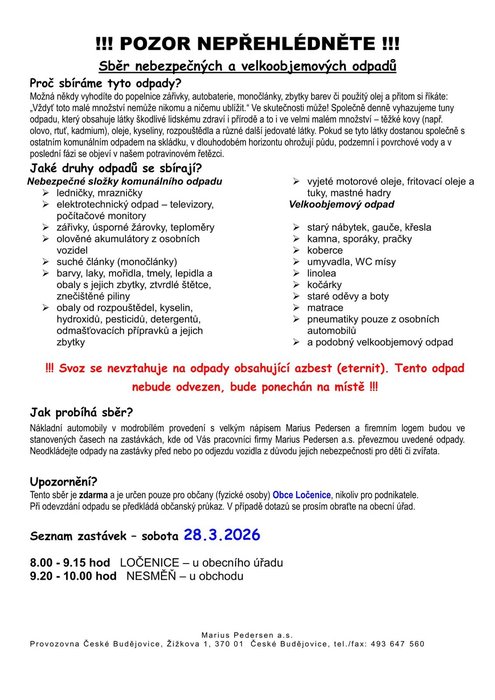 Sběr nebezpečných a velkoobjemových odpadů proběhne v sobotu 28.3.2026, viz leták.
