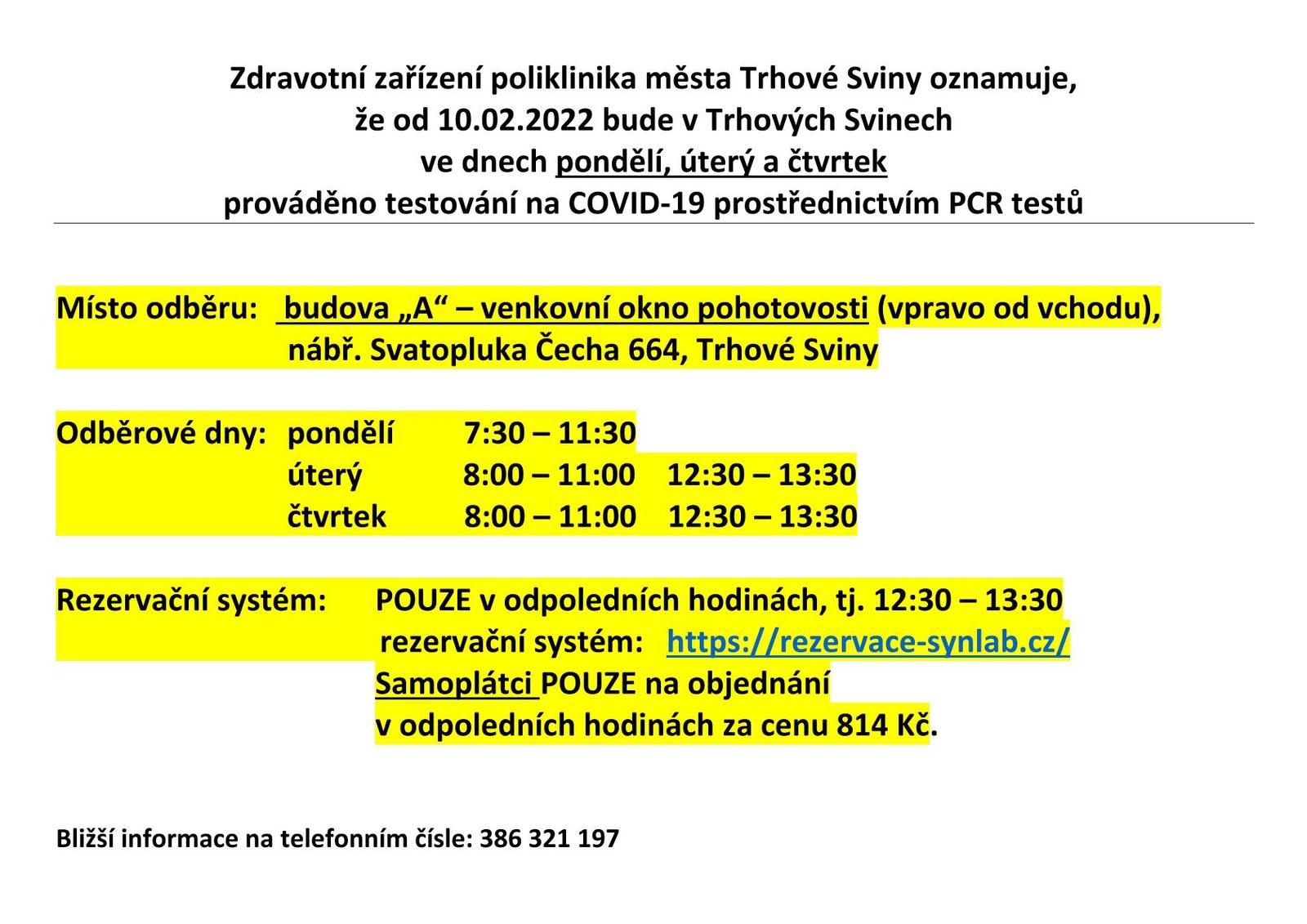 Zdravotní zařízení poliklinika města Trhové Sviny oznamuje, že od 10.02.2022 bude v Trhových Svinech ve dnech pondělí, úterý a čtvrtek prováděno testování na COVID-19 prostřednictvím PCR testů. Podrobnosti jsou uvedeny v přiloženém souboru.