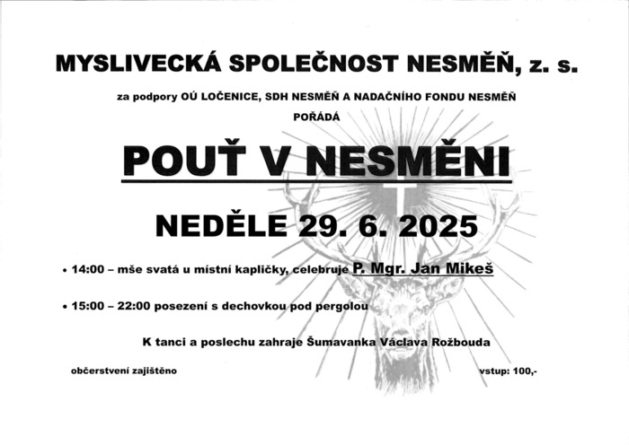 Myslivecká společnost Nesměň z.s. pořádá v neděli 29.6.2025 pouť v Nesměni.