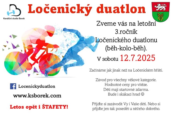 V sobotu 12. července 2025 proběhne na hřišti v Ločenicích Ločenický duatlon, registrace k závodům budou zahájeny od 08:30 hodin.