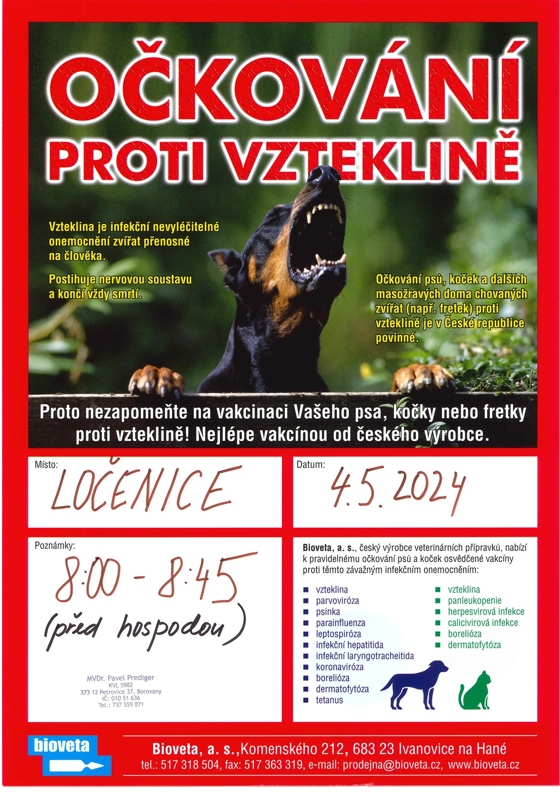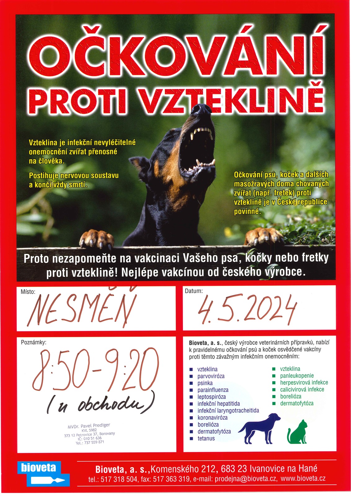 Úvod > Aktuality > V sobotu 4. května 2024 proběhne v Ločenicích a v Nesměni očkování psů proti vzteklině