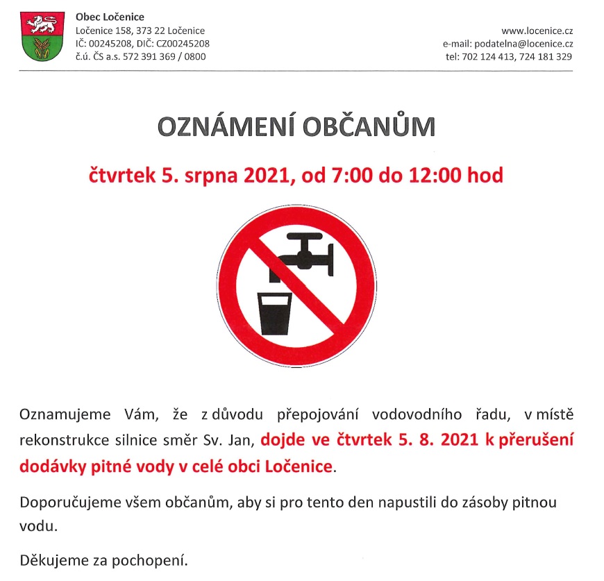 Oznamujeme občanům, že z důvodu přepojování vodovodního řadu, v místě rekonstrukce silnice směr Sv. Jan, dojde ve čtvrtek 5. srpna 2021, od 7:00 do 12:00 hod k přerušení dodávky pitné vody v celé obci Ločenice.