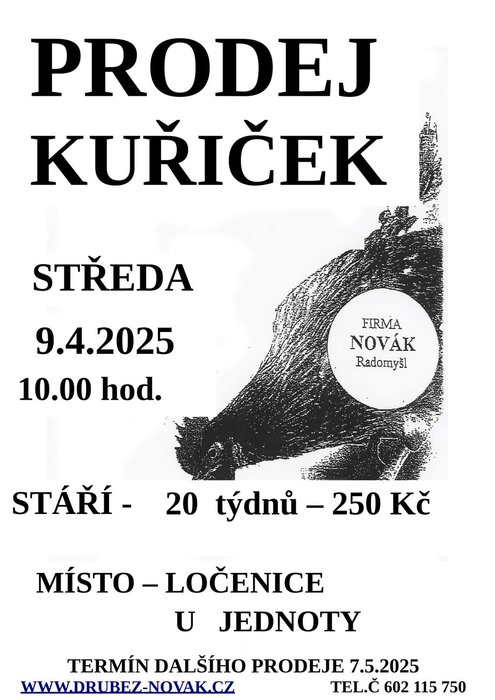 Úvod > Aktuality > Ve středu 9. dubna 2025 proběhne v Ločenicích před Jednotou v 10:00 hodin prodej kuřiček
