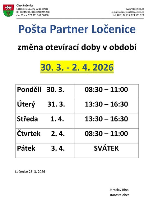 Úvod > Aktuality > Změna otevírací doby na Poště Partner Ločenice v týdnu od 30. března do 3. dubna 2026