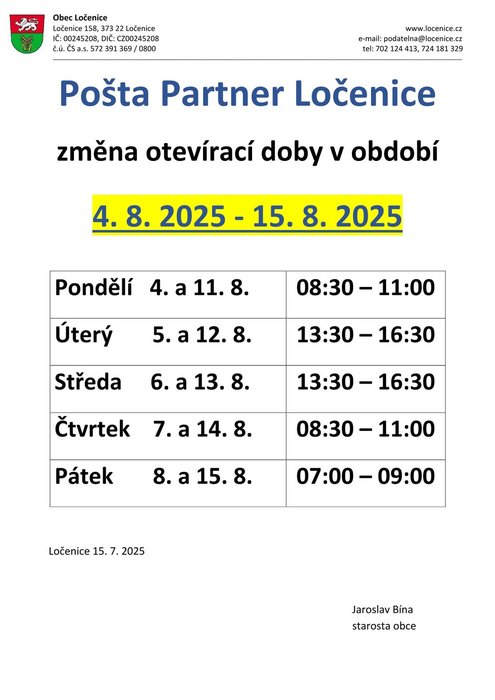 Změna otevírací doby na Poště Partner v Ločenicích v období od 4. do 15. srpna 2025 z důvodu čerpání dovolené